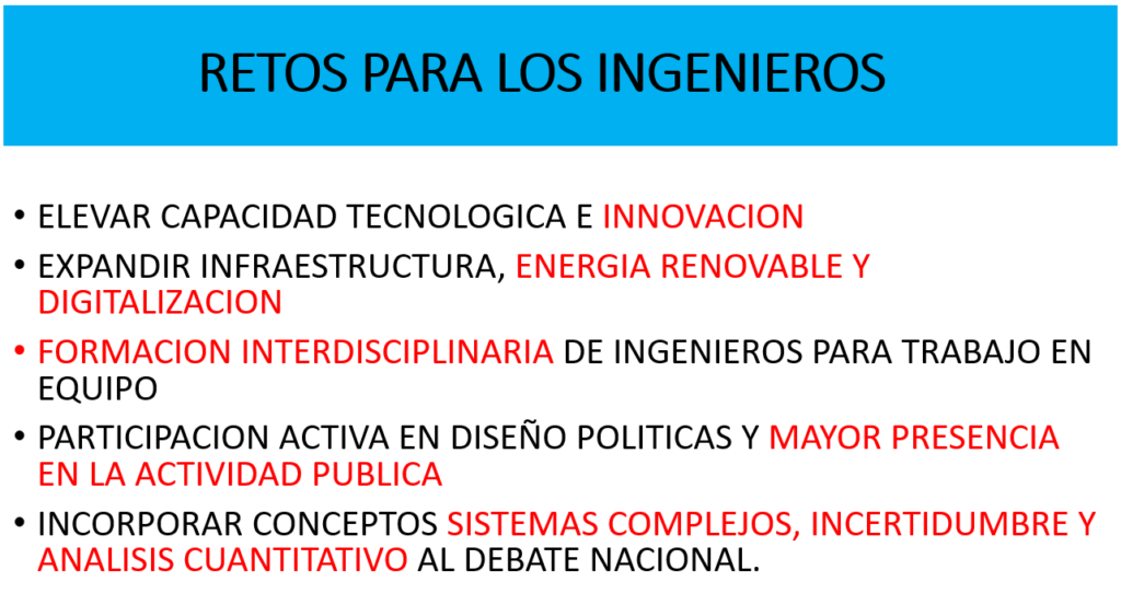 Para finalizar, permítanme referirme a la contribución de la ingeniería al modo de pensar y a la cultura. En la actividad política y en la gestión de gobierno se constata escaso rigor cuantitativo en todos nuestros países. Los latinoamericanos somos buenos para proponer soluciones simplistas, pero en general improvisados para diseñar respuestas a temas complejos, y menos para ejecutar bien. Urge elevar la capacidad de cuantificar, medir, deducir a partir de hechos, articular propuestas coherentes. Los ingenieros podemos contribuir a este propósito actuando más activamente en la esfera pública.