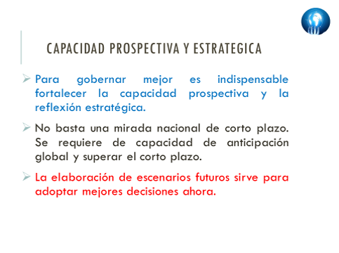 ¿Cómo prepararnos mejor? Pensar en futuro exige entender lo que está aconteciendo en el mundo y explorar los escenarios posibles en los próximos 10 o 20 años. En eso consiste la prospectiva. Luego elegir un escenario deseado, y diseñar una estrategia y adoptar las mejores políticas para alcanzarlo.