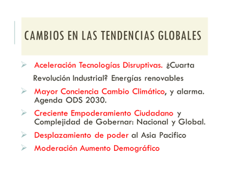 Podemos destacar seis tendencias globales. A) Las tecnologías disruptivas (que trascienden limitaciones físicas, energías verdes, tecnologías de comunicación, robótica e inteligencia artificial); B) el poder de los recursos naturales (escasez de agua, energías renovables); C) el cambio climático (reducción emisiones CO2); D) la urbanización (ciudades inteligentes), E) la demografía (envejecimiento, migraciones, desplazamiento de poder) y F) el empoderamiento ciudadano (clases medias emergentes, tecnología, educación y gobernabilidad compleja).