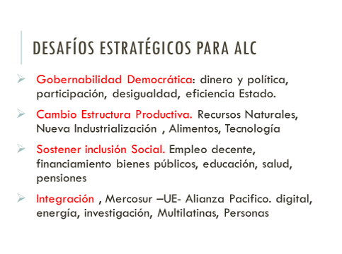 Tres desafíos mundiales deberá enfrentar cada país: elevar la tasa de crecimiento, extender la inclusión social y proteger el medio ambiente. Estos son también los desafíos estratégicos de América Latina. La infraestructura contribuye sustancialmente a los tres.