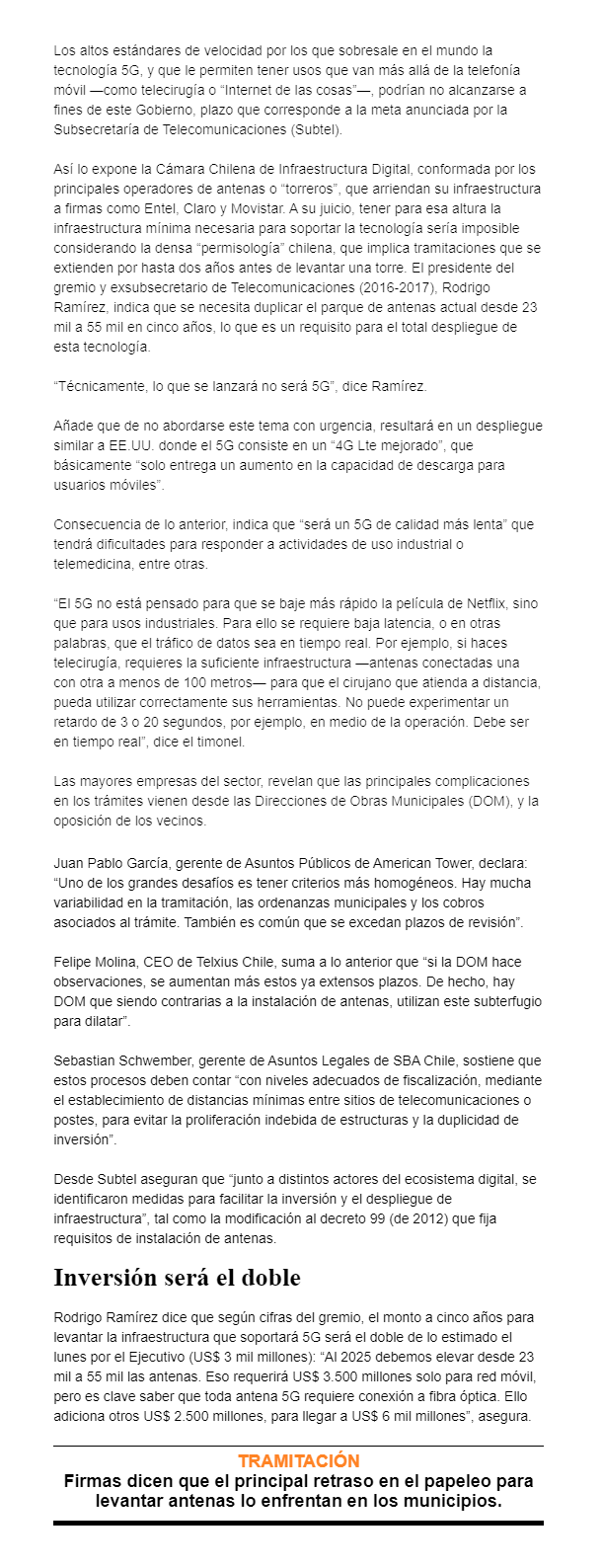 EL MERCURIO – Dicen que estas trabas impedirían tener la infraestructura necesaria para activar esta tecnología el primer trimestre de 2022, por lo que habría un servicio más lento
