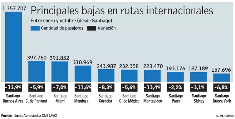 Pese a la importancia histórica y al peso -un 22,6% de la participación en el mercado internacional- que tienen los vuelos entre Chile y Argentina, también hay otras rutas que han mostrado una disminución de pasajeros entre enero y octubre. Tal es el caso de algunos destinos como Miami, Ciudad de México, Montevideo, París, Sídney, Nueva York o Punta Cana.