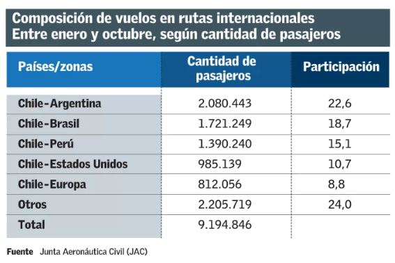 Ahora bien, en octubre, el crecimiento de 5,2% total fue explicado básicamente por el mercado local, que creció 12,8%, en desmedro de las operaciones internacionales, que cayeron 3,5%. Esta cifra es la mayor caída del año en tráfico internacional de pasajeros y la segunda consecutiva. El secretario general de la JAC, Jaime Binder, destacó las cifras globales y sostuvo que “el menor ingreso de turistas argentinos al país impactó en el tráfico a nivel total”. Sin ir más lejos, la ruta Santiago-Buenos Aires -una de las principales- disminuyó su cantidad de pasajeros en 20,3% en el décimo mes, mientras que Santiago-Mendoza cayó 15,8% y Santiago-Córdoba bajó 35,1%. Dichas frecuencias también han presentado un comportamiento de caídas a lo largo del año (ver infografía). “Muchas personas están optando a las ofertas de las compañías de bajo costo para viajar dentro de Chile. Ese factor también explica, en parte, la caída en los vuelos internacionales”, dijo Binder. Añadió, eso sí, que el tráfico internacional seguirá creciendo si nuevas aerolíneas -como la low cost Level- comienzan a arribar al país.