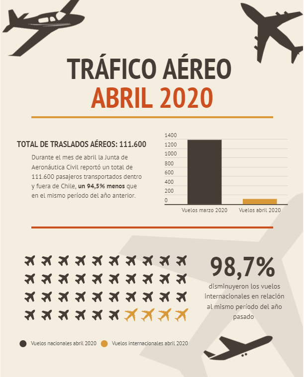 Del total, 100.321 pasajeros se transportaron dentro de Chile, lo que equivale a un descenso de 91,2%, en comparación con igual mes de 2019. En tanto, a nivel internacional los pasajeros transportados llegaron a 11.279, que se traduce en una disminución de 98,7%, en comparación con el mismo mes del año pasado.