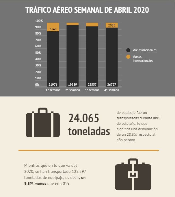 En cuanto a toneladas de correo, se transportaron 1.028 toneladas en vuelos nacionales e internacionales, lo que se traduce en una disminución de 10,8%.