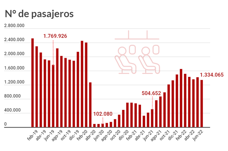 Según el informe de junio, que entrega también el ritmo en el flujo de viajeros durante el primer semestre, durante el sexto mes del año se verificó un alza de 829.413 pasajeros frente al mismo mes del año pasado, totalizando 1.334.065 personas, lo que representa un alza interanual de 64,3%. La cifra del mes sin embargo supone una caída frente a los 1.414.767 transportados en mayo pasado,