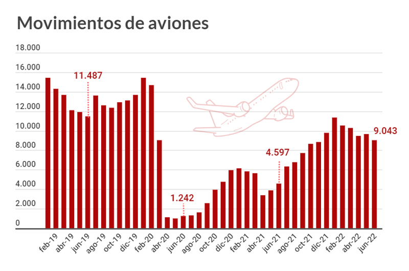 Respecto del número de operaciones (movimiento corresponde a un aterrizaje o un despegue), se registraron 9.043 durante junio, lo que equivale a un alza de 96,7% en relación al mismo mes de 2021. Para los seis primeros meses del año se contabilizan 60.472 operaciones, es decir, más del doble de lo que se registró el ejercicio pasado (104,9%).