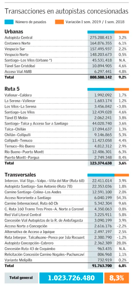 Lo anterior se desprende de estadísticas de la Dirección de Concesiones del Ministerio de Obras Públicas (MOP), donde se observa que en las autopistas urbanas el crecimiento fue de 9,24% anual en enero-junio, llegando a 808,6 millones de pasadas, que representan el 78% de las transacciones vehiculares. Esto incluye a vehículos livianos y pesados, que explican 89,63% y 10,37% del tránsito, respectivamente, en ese tipo de vías.