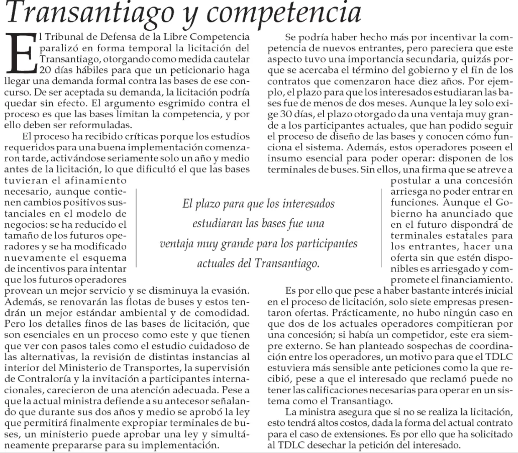 EL MERCURIO – El Tribunal de Defensa de la Libre Competencia paralizó en forma temporal la licitación del Transantiago, otorgando como medida cautelar 20 días hábiles para que un peticionario haga llegar una demanda formal contra las bases de ese concurso.