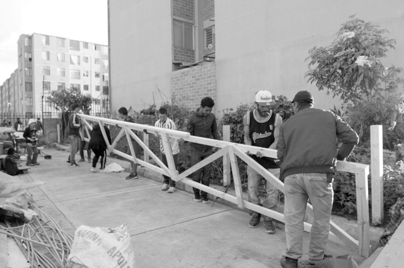 El proyecto “Negociaciones urbanas” [7], de cocreación y coconstrucción de mobiliarios móviles en el barrio Parques de Bogotá, durante dos meses de residencia in situ, con talleres en el espacio público cuatro días a la semana y centrado en tres organizaciones de base: de fútbol (30 jóvenes menores de 18 años), huertas (15 adultos mayores, mayoritariamente mujeres) y hip-hop (30 personas entre 16 y 33 años). Estos colectivos hip-hop lideraron un recorrido para estudiantes de arquitectura en el que exponían los principales conceptos aquí presentados, dinámica que despertó su interés por cartografiar el contexto. A partir de ahí se propuso un “grupo de estudios” a través de redes sociales para compartir textos, canciones o películas que hagan referencia a las contradicciones territoriales abordadas [8].
