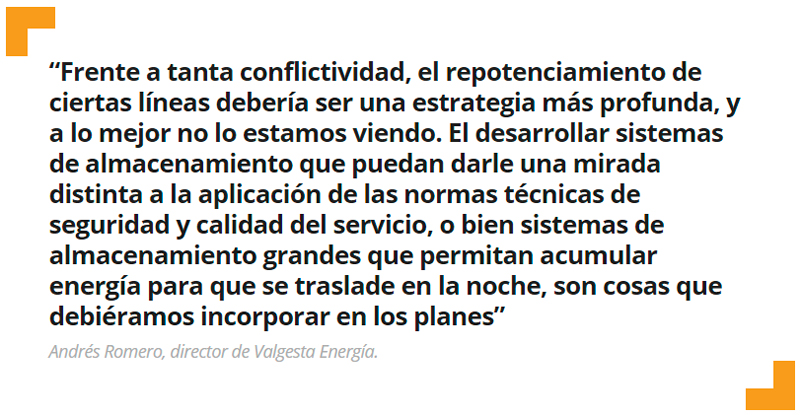 “Es decir, frente a tanta conflictividad, a lo mejor el repotenciamiento de ciertas líneas debería ser una estrategia más profunda, y a lo mejor no lo estamos viendo. El desarrollar sistemas de almacenamiento que puedan darle una mirada distinta a la aplicación de las normas técnicas de seguridad y calidad del servicio, o bien sistemas de almacenamiento grandes que permitan acumular energía para que se traslade en la noche, son cosas que debiéramos incorporar en los planes”, afirma.