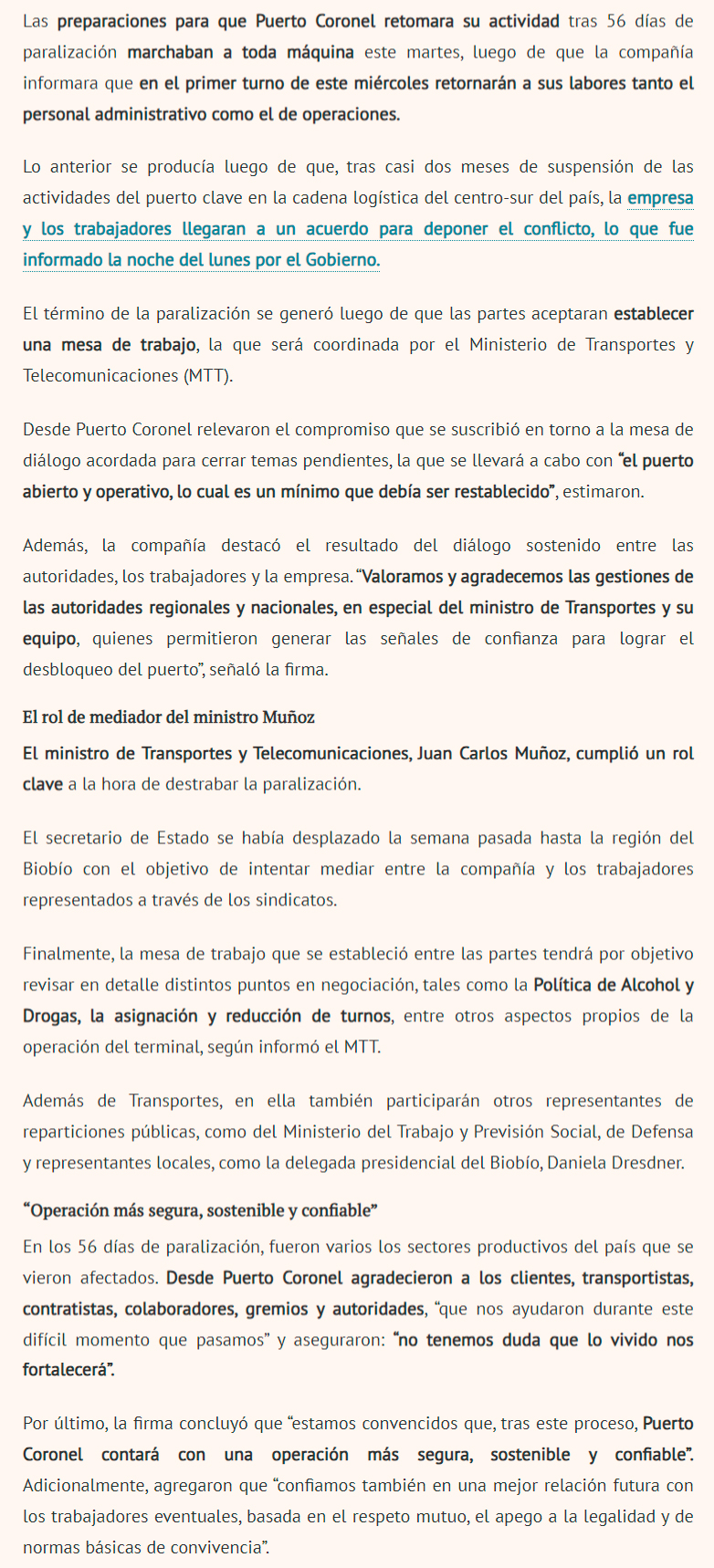 DIARIO FINANCIERO – La compañía informó que en el primer turno retornarán a sus labores tanto el personal administrativo como el de operación
