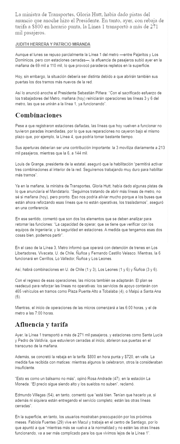 Fuente: El Mercurio, Miércoles 23 de Octubre de 2019