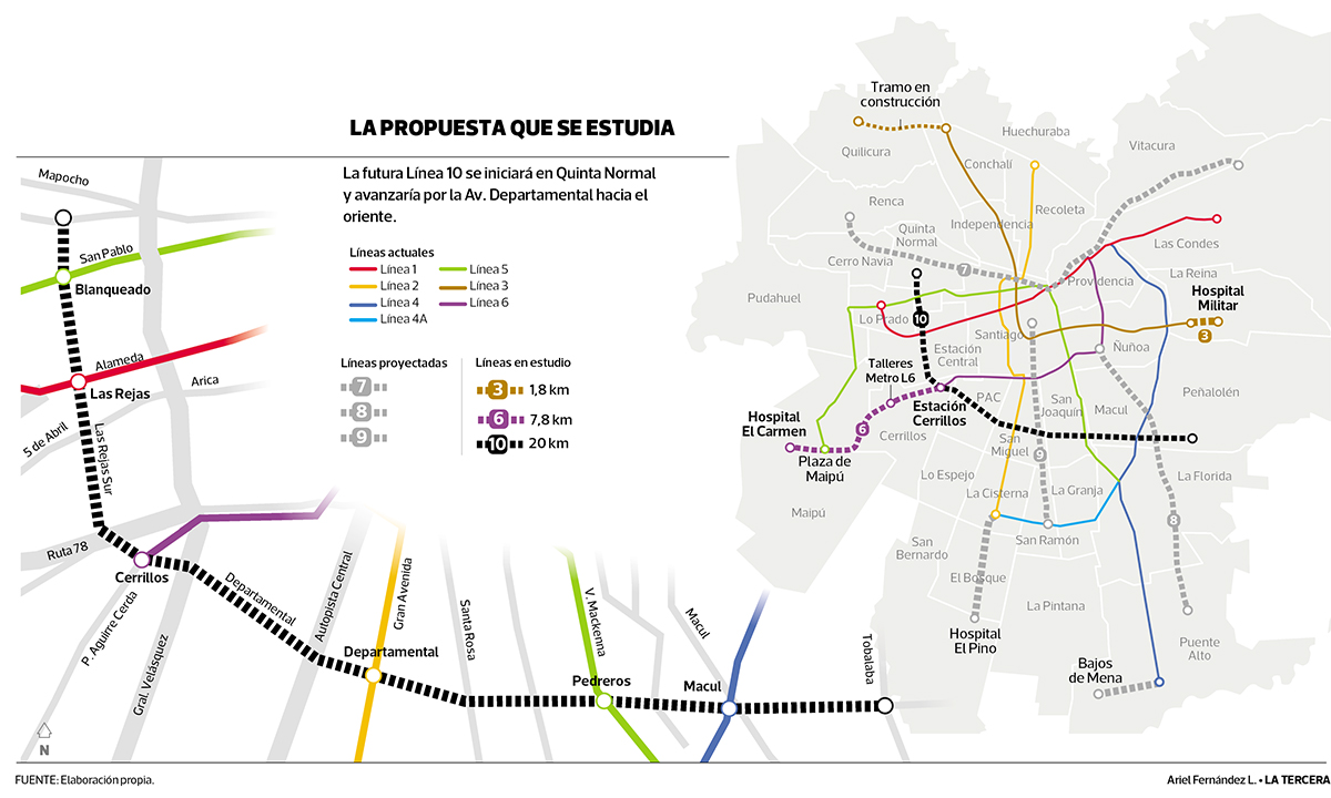 El Presidente también mencionó ayer que existe la idea de construir extensiones de los trazados actualmente en operación. Así, se podría concretar la ampliación de la Línea 6 desde Cerrillos al Hospital de Maipú. También se baraja un ramal que partiría en la Estación Fernando Castillo Velasco, de la Línea 3, hasta el Hospital de La Reina.
