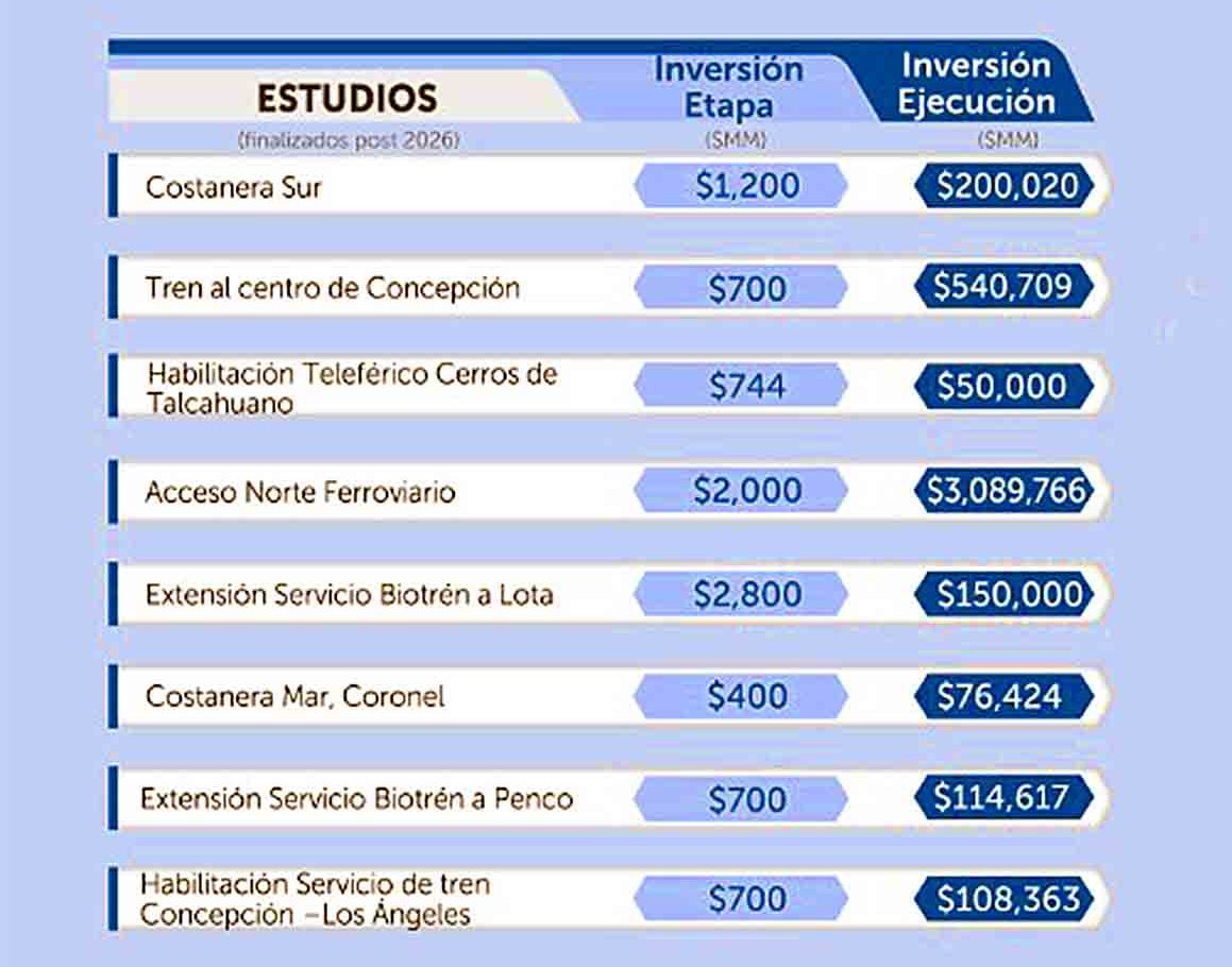 De hecho, este proyecto está incluido en el Plan Más Movilidad que fue presentado el pasado 5 de mayo por el ministro de Transportes, Juan Carlos Muñoz y el gobernador regional, Rodrigo Díaz, como forma de materializar, en un plazo de cinco años, 22 obras de infraestructura y transporte público para salir del déficit que en ambas materias se vive en el Concepción Metropolitano. Además contempla, el financiamiento de la etapa de estudios de otros 8 proyectos, entre ellos la prefactibilidad del tren rápido Concepción-Chillán y también otro proyecto que no es tan popular aún, que es el tren de pasajeros que unirá Concepción con la ciudad Los Ángeles, que también busca avanzar en sus primeras etapas.
