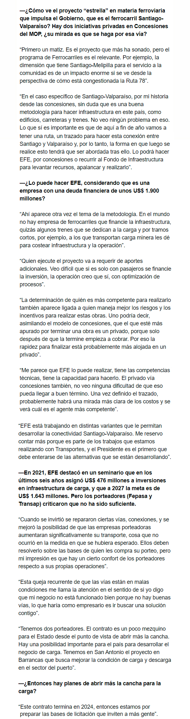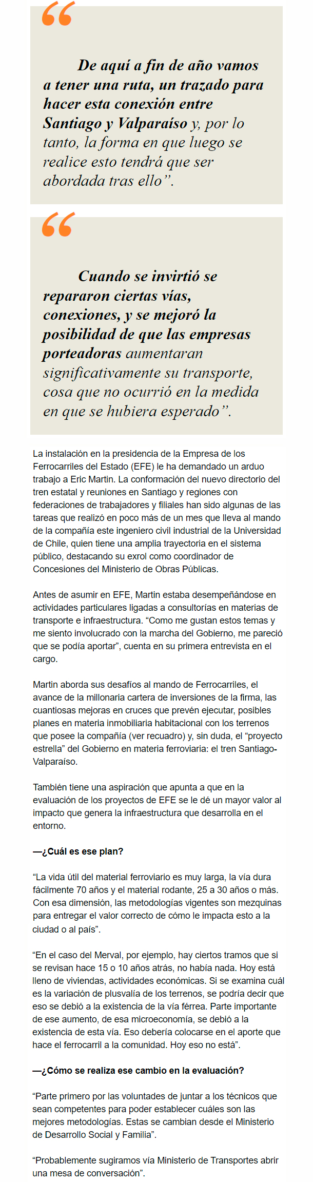 EL MERCURIO – Eric Martin, Presidente de Ferrocarriles, anticipa que trabajan distintas variantes para esa conectividad.