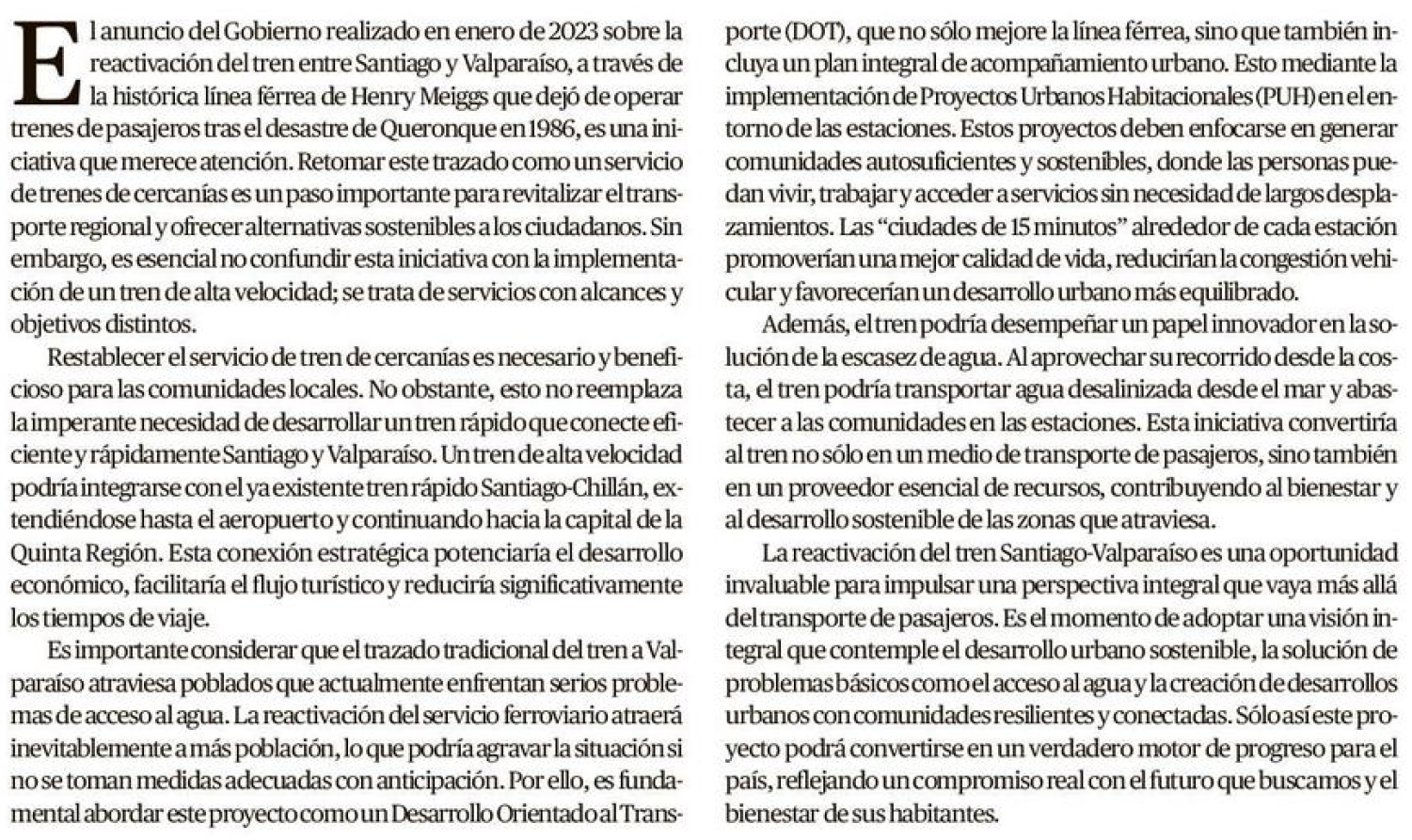 EL MERCURIO DE VALPARAÍSO – La reactivación del tren Santiago-Valparaíso es una oportunidad invaluable para impulsar una perspectiva integral que vaya más allá del transporte de pasajeros