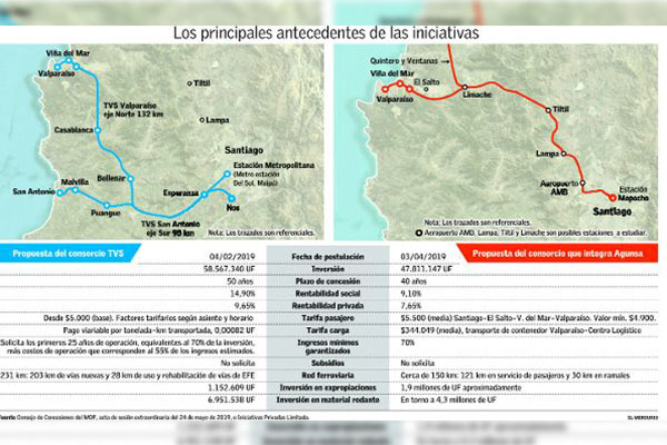 Por otra parte, la iniciativa de cerca de US$ 2.000 millones “Conexión Ferroviaria Santiago-V Región”, que considera un tren de carga y de pasajeros desde Santiago a Valparaíso —no va a San Antonio—, que empuja el consorcio Iniciativas Privadas, donde participa Agunsa (Urenda), estima una rentabilidad social de 9,1% y privada de 7,65%. Su tarifa media por pasajero es de $5.500 entre Santiago y Valparaíso, siendo el valor mínimo $4.900.