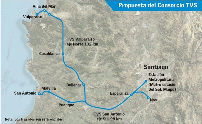 El 4 de febrero pasado, el consorcio TVS Concesiones Ferroviarias SpA —integrado por Sigdo Koppers y China Railway Group Limited (CREC)— presentó su proyecto de un tren rápido entre Santiago y Valparaíso por Ley de Concesiones en el MOP.