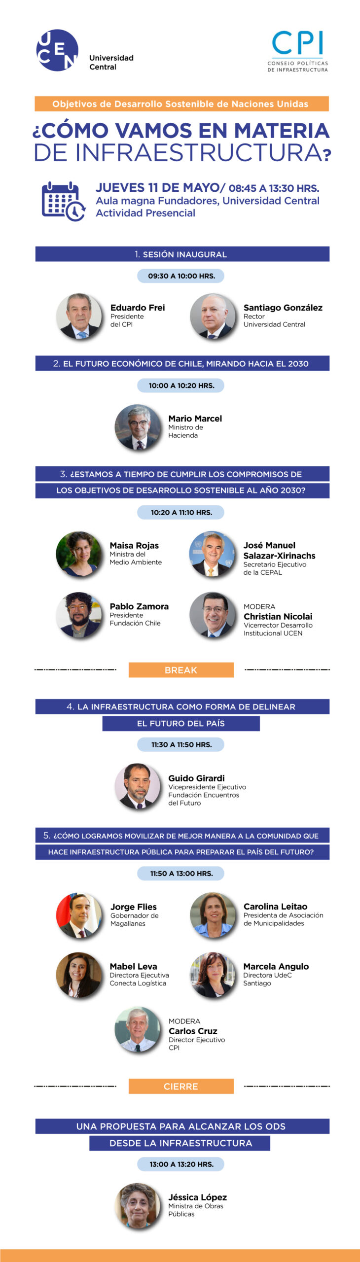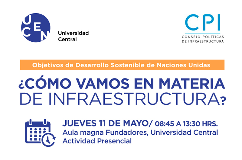 CPI – El Consejo de Políticas de Infraestructura (CPI) junto con la Universidad Central (UCEN) le invitan al Seminario “Objetivos de Desarrollo Sostenible de Naciones Unidas: ¿Cómo vamos en materia de infraestructura?”, el cual se llevará a cabo, de forma presencial, en el Aula Magna Fundadores de la Universidad Central, el jueves 11 de mayo entre las 08:45 y 13:30 horas.