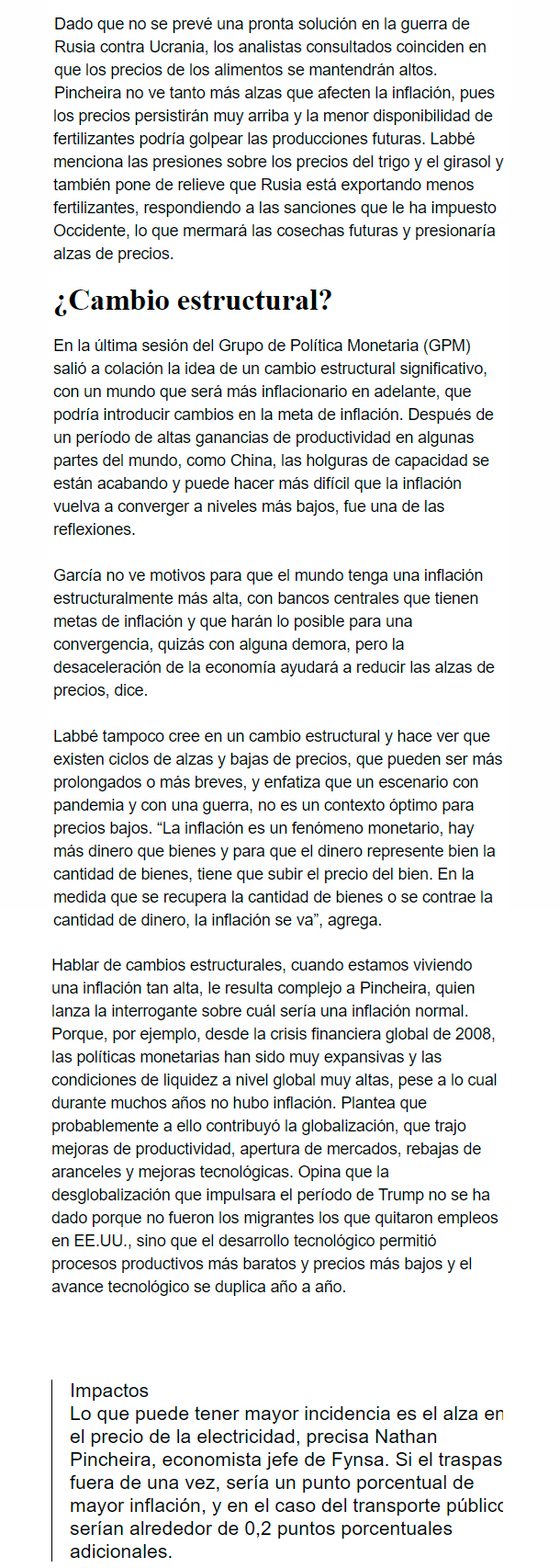 EL MERCURIO – Tras cerrar 2022 entre 11% y 13,5%, prevén que la inflación irá cediendo conforme la pandemia y los problemas logísticos a nivel mundial global queden atrás, persistiendo el precio alto de alimentos por la guerra.