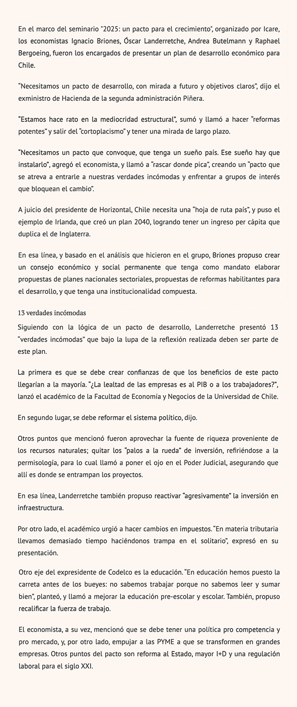 DIARIO FINANCIERO – En el planteamiento, que incluye crear un consejo permanente, modificar impuestos, la educación y los permisos para aprobar inversiones, participaron además Andrea Butelmann y Raphael Bergoeing