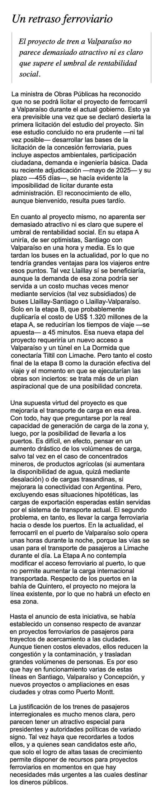 EL MERCURIO – El proyecto de tren a Valparaíso no parece demasiado atractivo ni es claro que supere el umbral de rentabilidad social.
