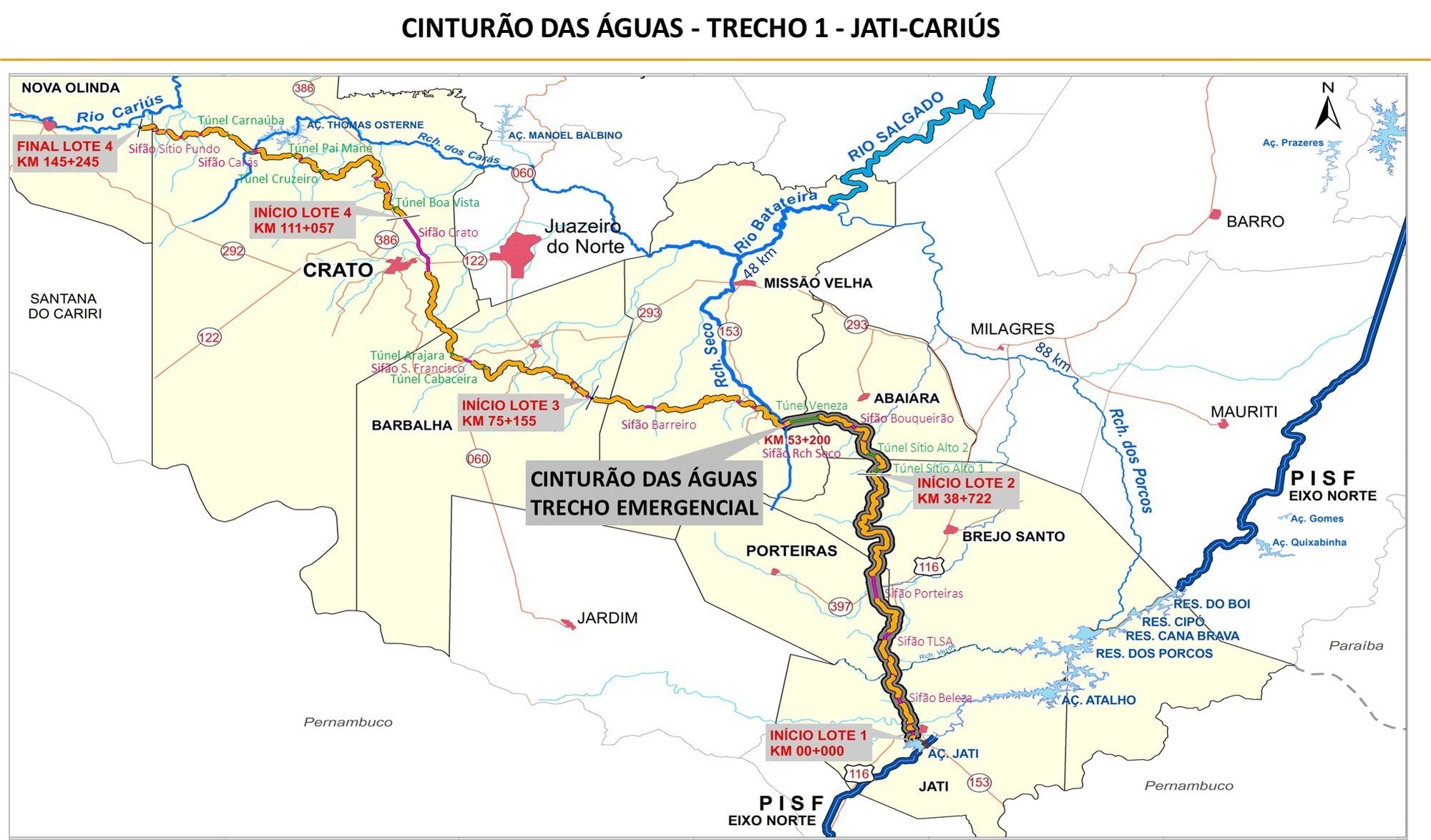 La captación del agua ocurre en la presa de Jati, la cual pertenece al Eje Norte del Proyecto de Integración del Río San Francisco. Desde ese punto, el caudal recorre el territorio hasta llegar a las nacientes del río Cariús, en el municipio de Nova Olinda.