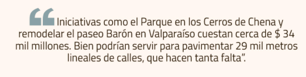 Sólo dos iniciativas promovidas por el MINVU (el Parque en los Cerros de Chena y la remodelación del paseo Barón en Valparaíso) representan cerca de 34 mil millones de pesos, que bien podrían servir para pavimentar 29 mil metros lineales de calles, que hacen tanta falta. Si bien esas iniciativas tienen un impacto muy importante en la generación de áreas verdes o en dotar a ciudades de zonas recreacionales, están muy lejos de los intereses manifestados por las comunidades durante los últimos meses, lo que queda bien reflejado en el tipo de propuestas que han surgido desde el CNDU.