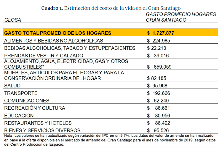 Tomando los datos de la Encuesta de Presupuestos Familiares VIII del INE[3], actualizando sus valores para el año 2019 por reajuste del IPC y agregando a estos gastos el valor promedio del arriendo de una vivienda en el Gran Santiago, estimamos cuánto vale realmente vivir en la capital sin problemas: $1.727.877. (Cuadro 1). Los $300.000 de la pregunta de Soledad Mella sólo cubren 1/6 de lo necesario.