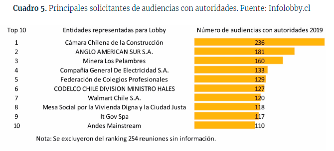 Es importante tener esto en cuenta pues el suelo disponible en esas comunas comenzó a escasear y el capital requiere que el Estado genere nuevos focos de valorización del suelo urbano. Así, los principales agentes del mercado inmobiliario (los peces grandes) ejercen su poder para gestionar con el Estado mejoras en el acceso a suelos bien localizados o a generar nuevos suelos de buen valor mediante nuevas inversiones públicas (nuevas líneas de metro, nuevos parques, nuevos permisos para grandes áreas comerciales, etc). No es raro que la CChC, acaso la principal entidad gremial de Chile, haya sostenido más de 235 reuniones[12] con autoridades en todo Chile (cuadro 5)