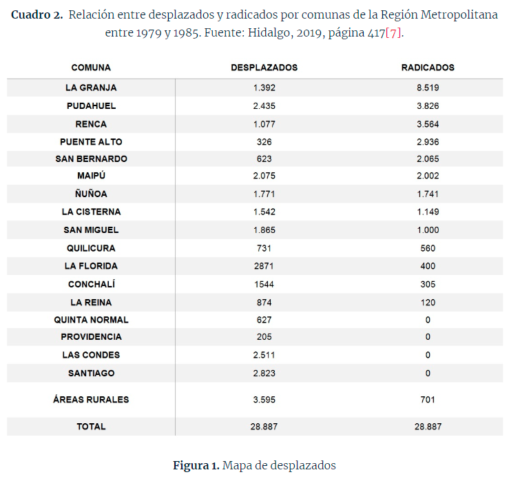 Indica las comunas de origen de las familias desplazadas y su número entre 1979 y 1985. Fuente: Juan Correa en base a Hidalgo, 2019.