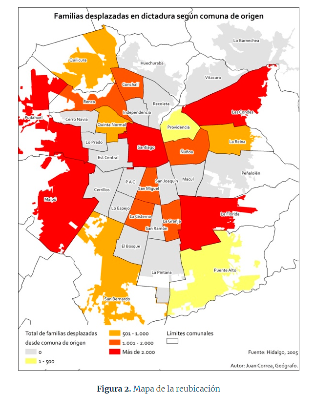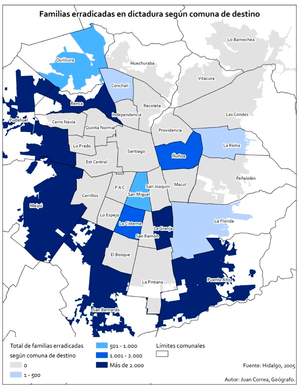 En 1982, Santiago pasó de tener 15 comunas a 32. Con los años, estas tendieron a caracterizarse según nivel socioeconómico, marcadas en gran parte por acción directa del Estado, que continuó desplazando pobladores hacia el sur hasta 1989. Como se puede ver en el cuadro 2, las comunas más ricas recibieron 0 pobladores, mientras 28 mil hogares desplazados se repartieron en el resto del gran Santiago, configurando la existencia de comunas para hogares pobres.