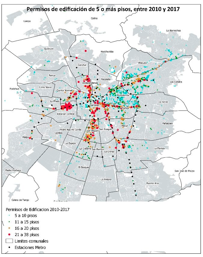 Figura 3. Mapa que presenta las estaciones de metro y los permisos de edificación de 5 o más pisos entre 2010 y 2017. Fuente: Centro Producción del Espacio