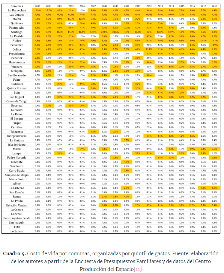 *En la EPF VIII no se ha incluido en los recuadros el valor del arriendo promedio, nosotros lo hemos incorporado para definir el gasto promedio completo.La discusión sobre la desigualdad tampoco incorpora el componente espacial. Pero sabemos que la experiencia urbana de vivir en Las Condes o en La Pintana es sideralmente diferente. Una comuna rica ofrece veredas de calidad y espacios arborizados donde las condiciones climáticas son mejor controladas; hay mayor disponibilidad de bienes públicos como bancas, calzadas en buen estado, colegios y centros de salud, por mencionar algunos; y la concentración del poder de compra atrae servicios privados de calidad. En una ciudad ordenada a partir del lucro de los entes privados, carecer de los recursos implica ser marginado de las zonas de la ciudad donde se concentran los mejores bienes públicos y los servicios privados de mejor calidad, lo que mejora la vida de las personas más allá de los ingresos que tienen. Este es uno de los motivos por los que el urbanismo es clave en la desigualdad.En la discusión sobre la desigualdad, el nivel real de gastos que recaen sobre el bolsillo de las familias prácticamente no se menciona. No se habla de plata sino de porcentajes, lo que encripta la discusión y genera distancia con muchos hogares. En noviembre, por ejemplo, el Congreso fijó como meta un salario mínimo de $550.000[4]. Sin embargo, eso es insuficiente para vivir sin apremios, incluso cuando dos personas del hogar trabajan por ese monto.