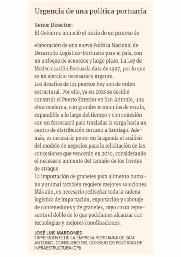 DIARIO FINANCIERO – Es necesario poner en la agenda el análisis del modelo de negocios para la relicitación de las concesiones que vencerán en 2030, considerando el necesario aumento del tamaño de los frentes de atraque
