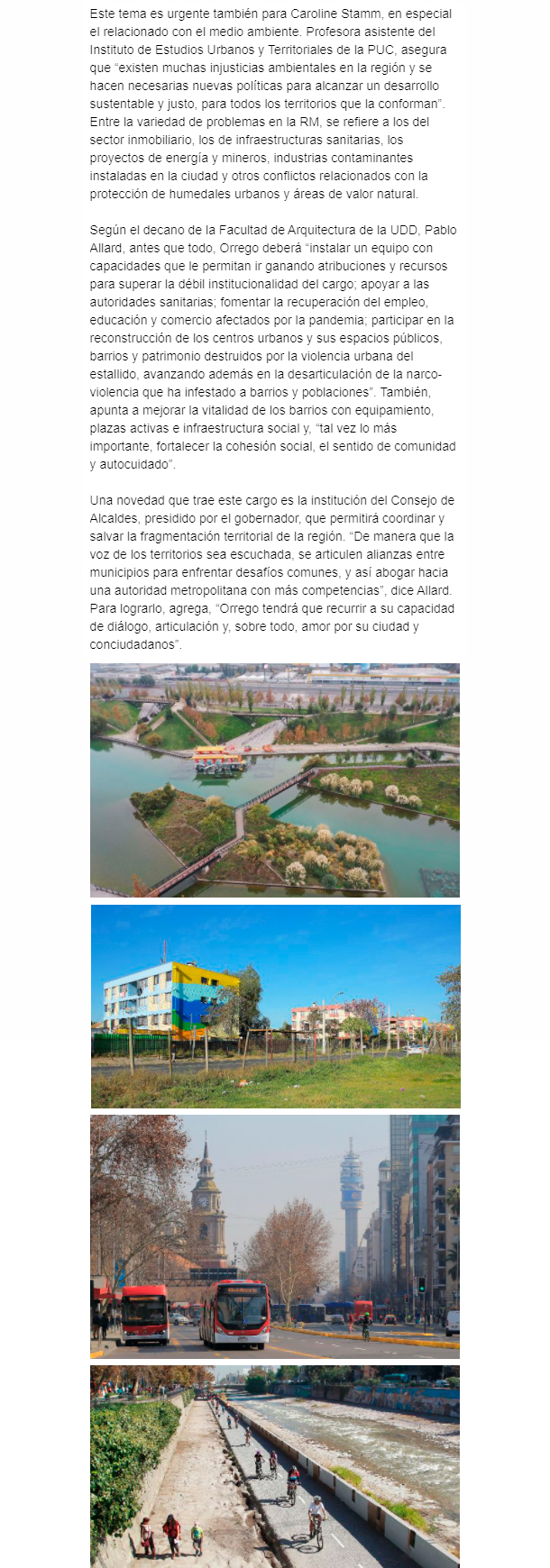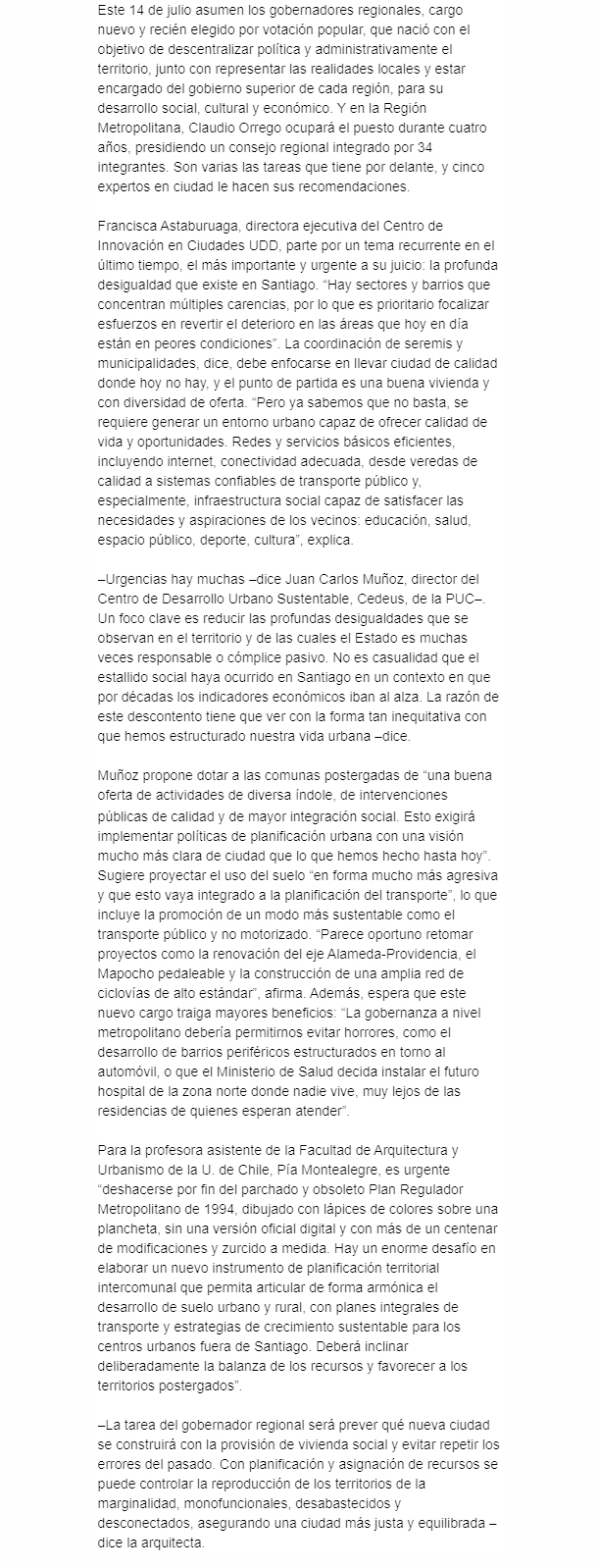 VD – EL MERCURIO – Cinco expertos en ciudad hablan sobre las prioridades del cargo “gobernador metropolitano”, en temas de desigualdad territorial, uso de suelo, medio ambiente, transporte, vivienda, calidad de vida y más.