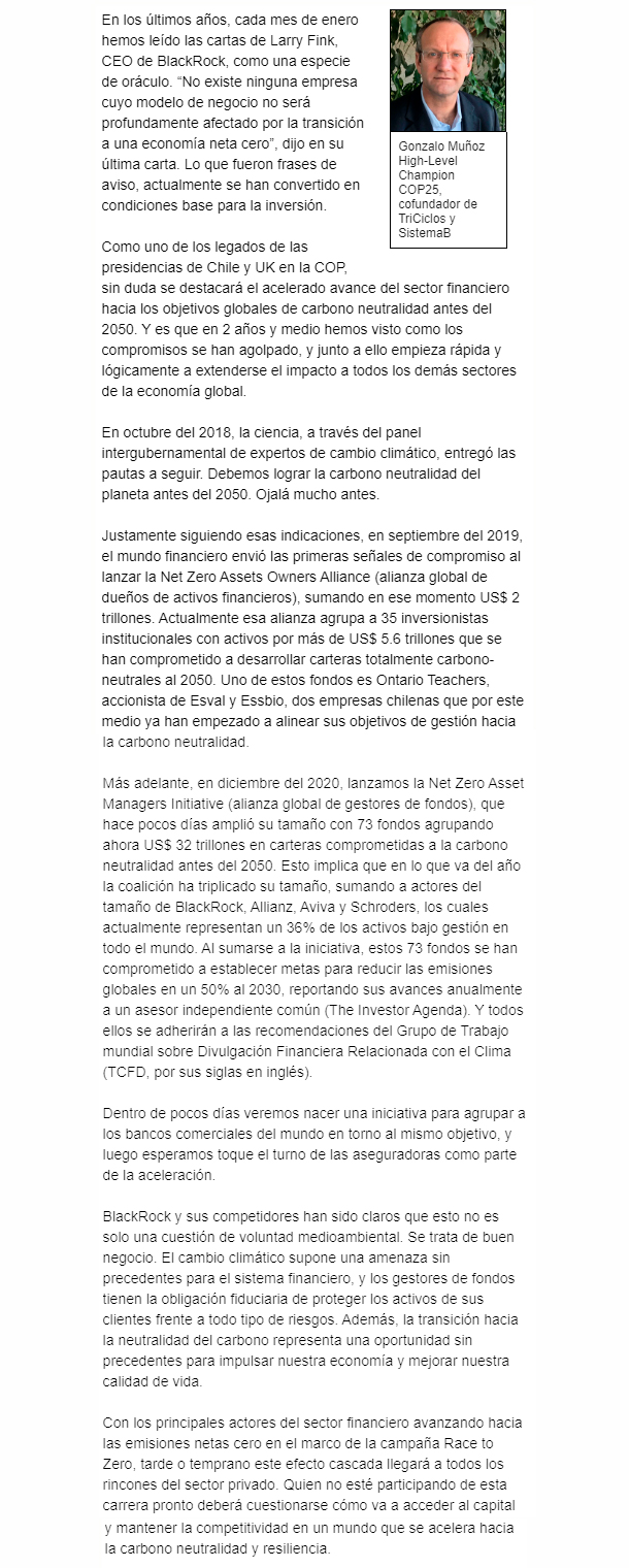 EL MERCURIO – Como uno de los legados de las presidencias de Chile y UK en la COP, sin duda se destacará el acelerado avance del sector financiero hacia los objetivos globales de carbono neutralidad antes del 2050.
