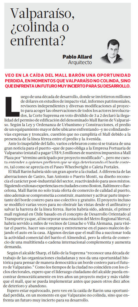 LA TERCERA – Luego de una década de desarrollo, donde se invirtieron millones de dólares en estudios de impacto vial, informes patrimoniales, revisores independientes y diversas modificaciones al proyecto para acoger las observaciones de todos los actores involucrados, la Corte Suprema en voto dividido de 3 a 2 declaró la ilegalidad del permiso de edificación del denominado Mall Barón de Valparaíso. Según la Ley y Ordenanza de Urbanismo y Construcciones, el predio de un equipamiento mayor debe ubicarse enfrentando -y no colindando- vías expresas y troncales, cuestión que no cumpliría el Mall debido a la presencia de la línea férrea entre el predio y la Avenida.