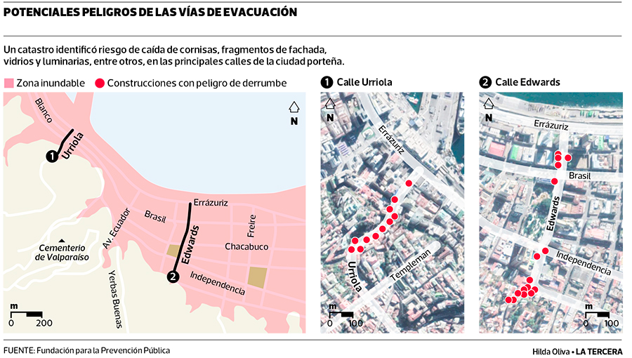 Según el documento, solo en las calles Urriola y Edwards habría al menos 20 eventuales peligros para quienes arranquen por allí en caso de una emergencia.