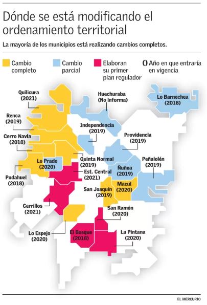 EL MERCURIO – Un sondeo realizado por “El Mercurio” arrojó que de las 34 comunas del Gran Santiago, 20 están realizando cambios a sus planos reguladores. En la mayoría de estas (13), las modificaciones que se trabajan afectarán a todo su territorio.