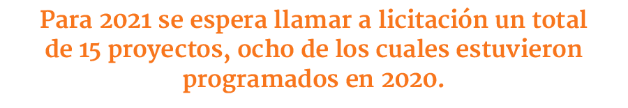 Es así que para 2021 se espera llamar a licitación un total de 15 proyectos, de los cuales ocho estaban en la lista del año pasado. A estos se suman la quinta concesión del Aeropuerto de Puerto Montt, la tercera concesión del Aeropuerto El Loa, la segunda concesión Ruta 5 tramo Chillán-Collipulli, la Ruta 58, Ruta Pie Monte, el Hospital Metropolitano Norte y el Instituto Nacional de Neurocirugía.