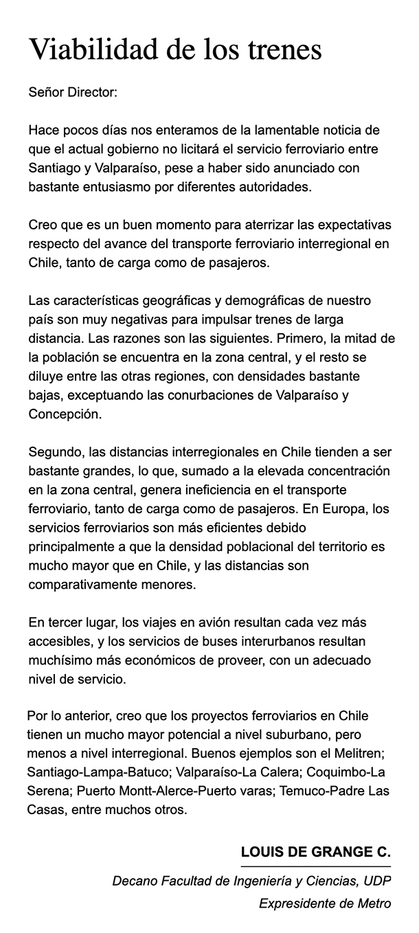 EL MERCURIO – Creo que es un buen momento para aterrizar las expectativas respecto del avance del transporte ferroviario interregional en Chile, tanto de carga como de pasajeros.