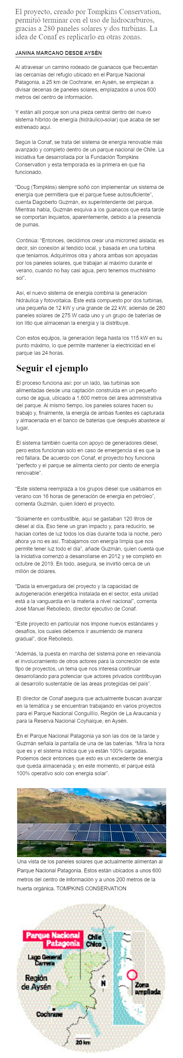 EL MERCURIO – El proyecto, creado por Tompkins Conservation, permitió terminar con el uso de hidrocarburos, gracias a 280 paneles solares y dos turbinas