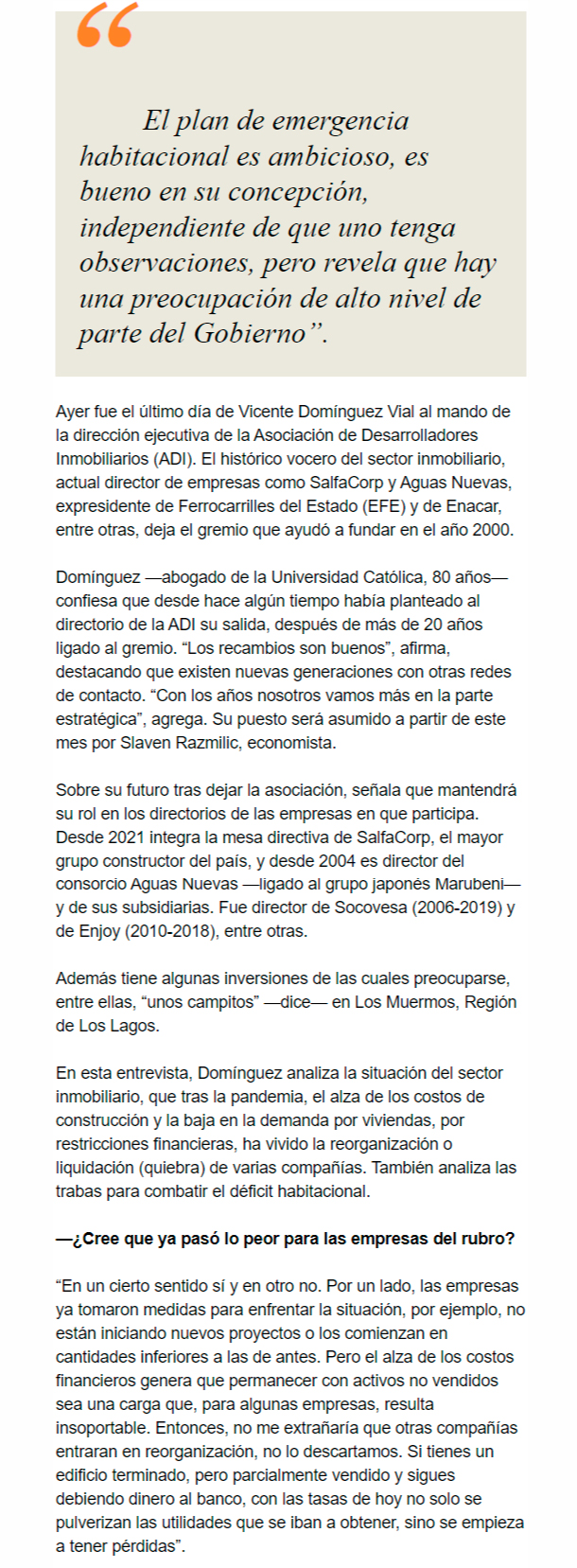 EL MERCURIO – El histórico director ejecutivo de la Asociación de Desarrolladores Inmobiliarios (ADI) analiza las “dos almas” que advierte en el Estado en materia de vivienda.